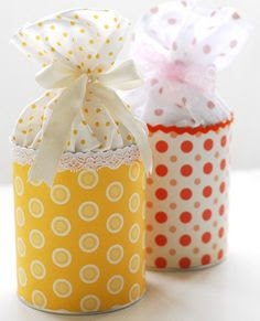 | Aquela lata de leite em pó vazia pode se transformar num lindo presente personalizado. Tecido ou papel contact decorado, renda, tecido e fita. Fica linda para presentear biscoitos, não é mesmo? |